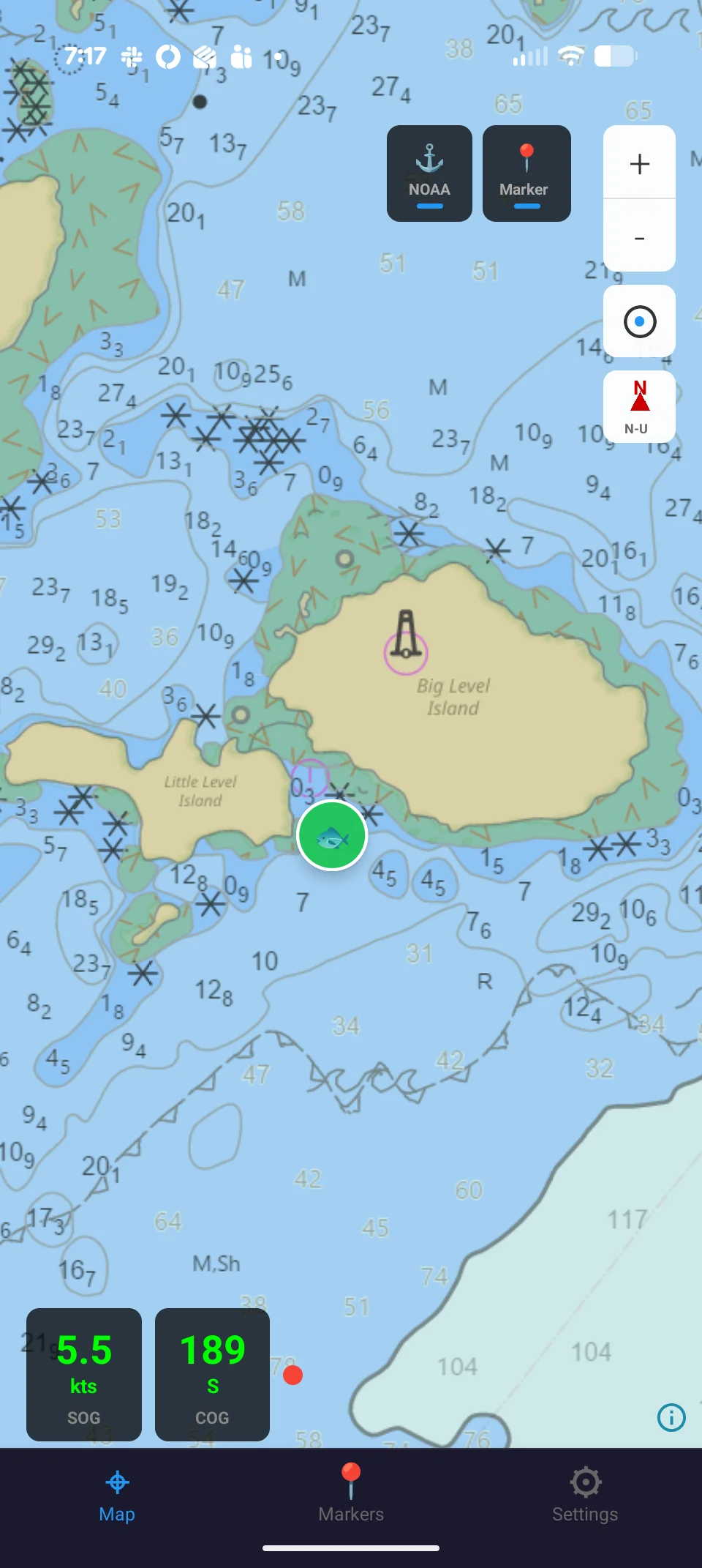 Official NOAA nautical charts with full detail — channel markers, depth soundings, hazards, and more.